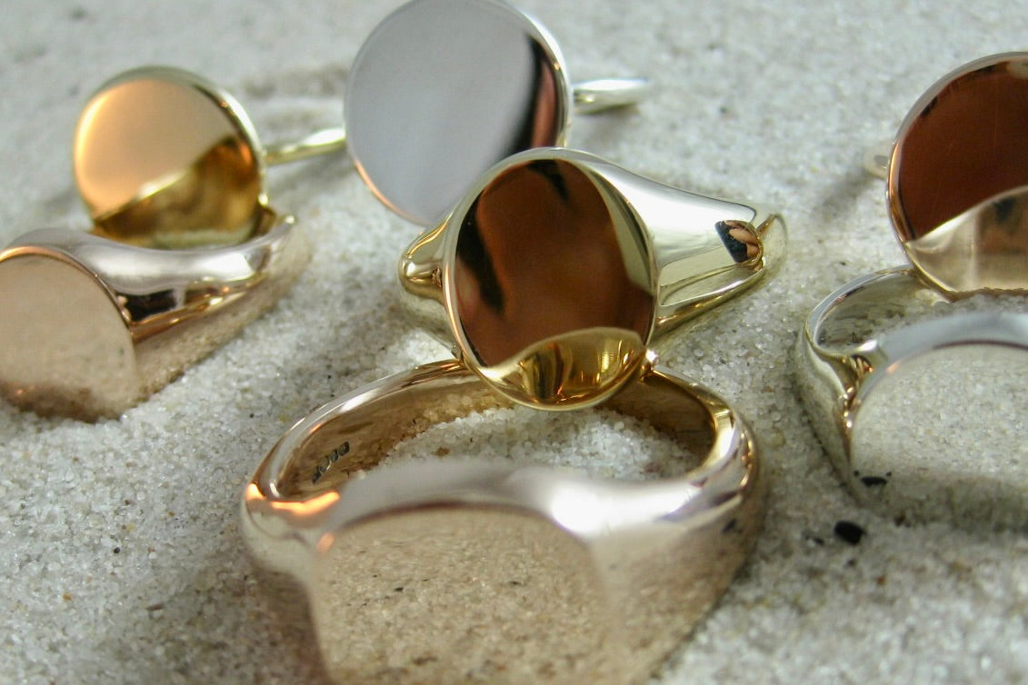 Most of our blank signet rings are crafted from English stamped (annealed) and hallmarked 9 and18 carat gold and sterling silver.